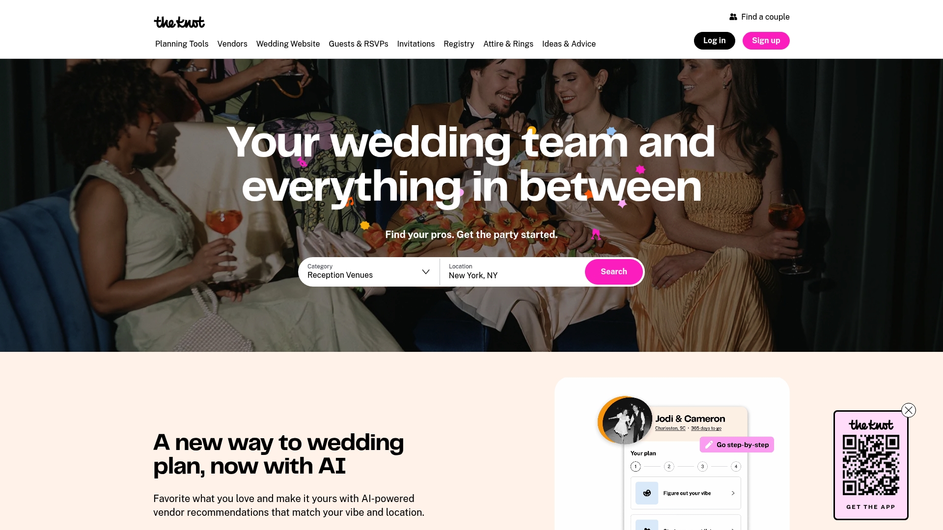 The Knot combines AI-powered vendor recommendations with a customizable wedding website builder and tools for guest list management and invitations. The platform also hosts a large vendor marketplace and stores reviews from couples to help with informed decisions.