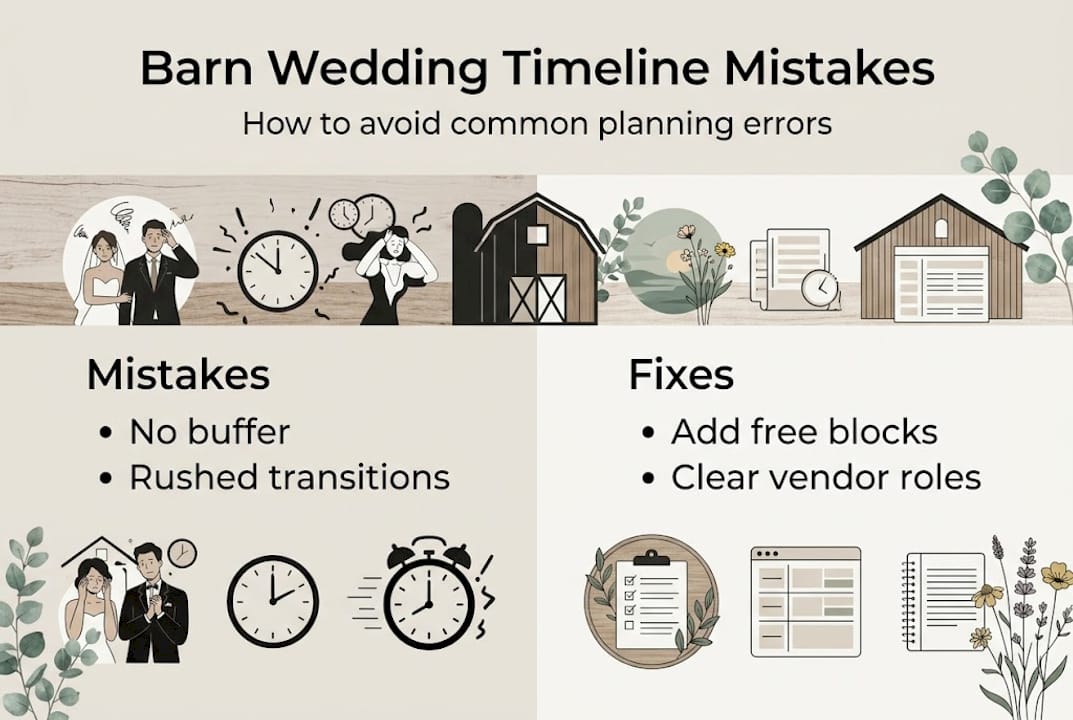The most common mistakes we see are overstuffed schedules with no breathing room, and transition times that are wildly underestimated. Moving 120 guests from a ceremony field to a reception barn takes longer than you think.