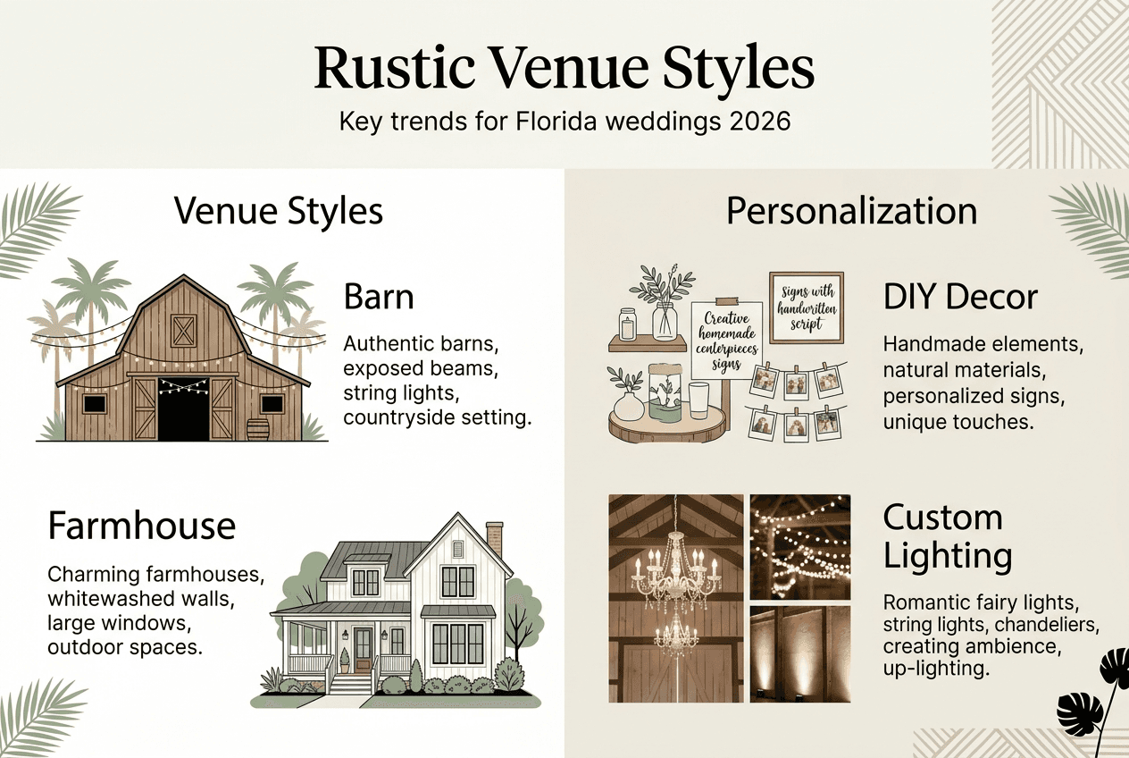 | Rustic venue dominance | Over 40% of Florida couples choose rustic barn venues for their authentic charm and versatility in 2026. |