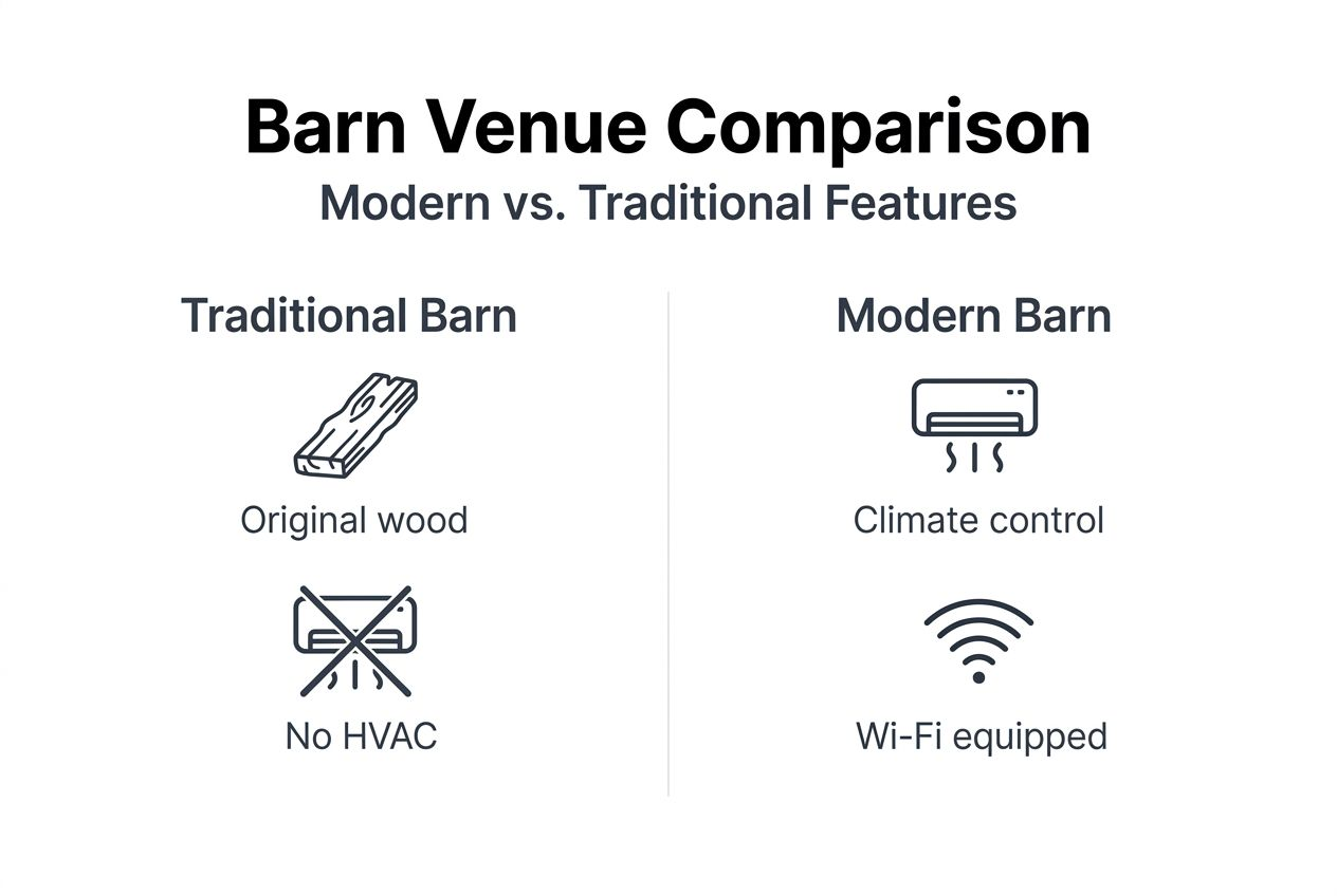 Modern barn venues integrate updated infrastructure like climate control, Wi-Fi, and professional audio-visual systems while preserving rustic aesthetics through original architecture and pastoral settings. Traditional barns maintain authentic structures but typically lack these contemporary amenities, relying instead on natural ventilation and minimal technology that can compromise guest comfort during events.