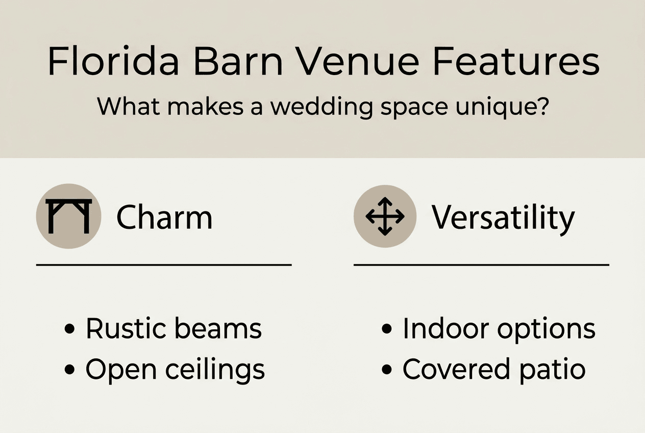 | Florida barn venues offer versatile settings | Adaptable spaces handle weather changes and accommodate both ceremonies and receptions seamlessly. |
