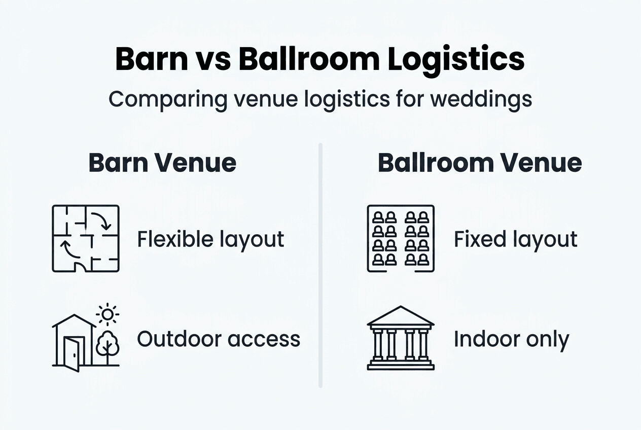 | Logistical Challenge | Barn Venue Impact | Traditional Ballroom Impact |